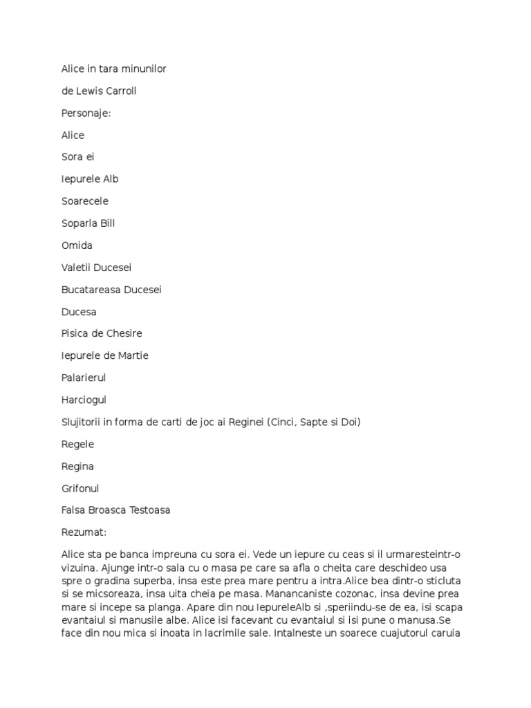 Alice in tara minunilor rezumat. Puteti gasi foarte multe referate accesand categoriile din partea dreapta despre rezumat pe scurt alice in tara minunilor uita te mai jos si o sa gasesti cele mai relevante rezultate pentru cautarea rezumat pe scurt alice in tara minunilor. Cartea este considerată unul dintre cele mai bune exemple a literaturii absurdului. Puteti gasi foarte multe referate accesand categoriile din partea dreapta despre rezumat pe scurt alice in tara minunilor. Alice in tara minunilor de lewis carroll personaje.