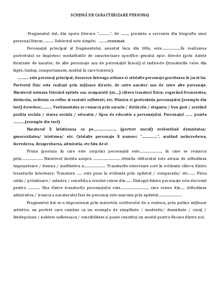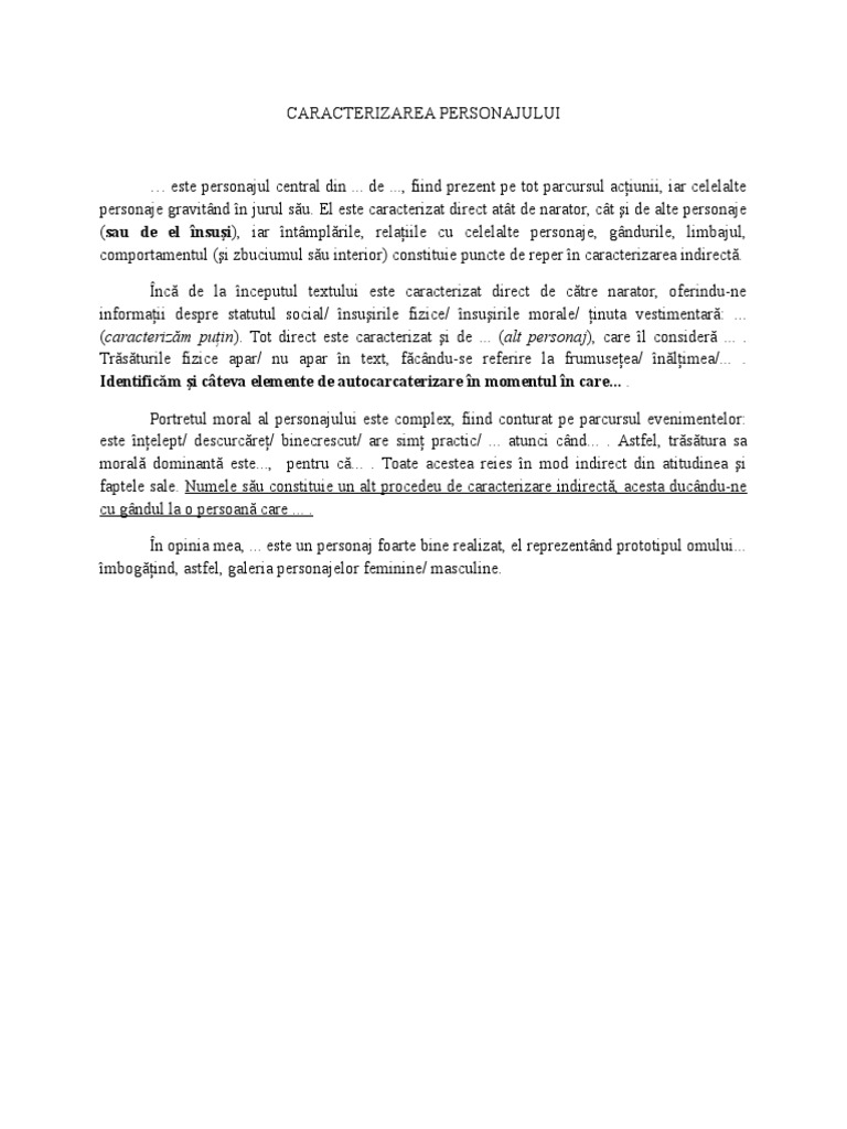 Caracterizarea indirectă reiese din faptele personajului comportamentul acestuia atitudinea gândurile numele și limbajul acestuia dar și din indicațiile regizorale în operele literare care aparțin genului dramatic. 24 noiembrie 2019 12 22. Caracterizarea in antiteza cu spanul este foarte evidenta din tipologizare harap alb fiind un personaj pozitiv iar spanul un personaj negativ faptele fiecaruia oglindind pana la urma destinul fiecaruia harap alb domnind pe veci alaturi de o frumoasa fata fiind iubit de toti iar spanul murind in chinuri de la inaltime. Dintre eseurile noastre am selectat mai multe exemple ce îți vor fi de ajutor pentru a te orienta în scrierea unei caracterizări.