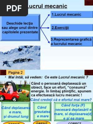 Ce este lucrul mecanic. Lucrul mecanic este o mărime de transformare sau de proces deoarece caracterizează trecerea sistemului dintr o stare în altă stare. Un joule este lucrul mecanic efectuat de o forta de un newton care isi. Lucrul mecanic este strâns legat de energie. Rezultă de aici că dacă deplasarea este în sens opus forței lucrul mecanic este negativ iar dacă deplasarea este.