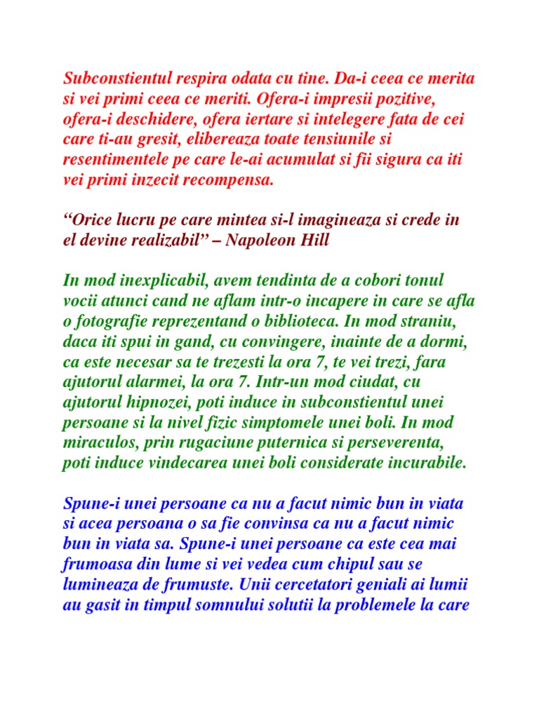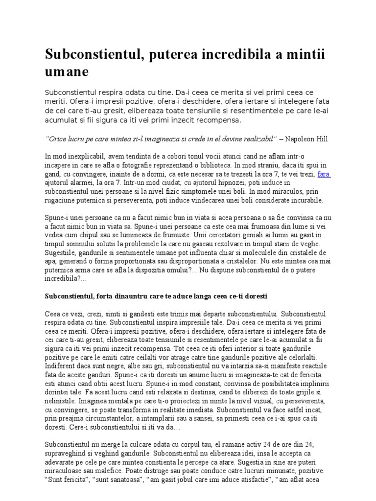 Eu cred ca este suma tuturor gandurilor noastre a sentimentelor a ceea ce simtim pentru cei din jur. Comportamentul nostru are la baza actiuni si interactiuni care s au format prin intermediul repetitiei. Subconstientul este foarte important findca el capteaza tot timpul sunete imagini gusturi mirosuri etc iar apoi le clasifica si le organizeaza. Hai să vedem ce este subconstientul cum funcţionează şi care sunt tehnicile prin care îl poţi folosi pentru a atrage ceea ce îţi doreşti în viaţă.