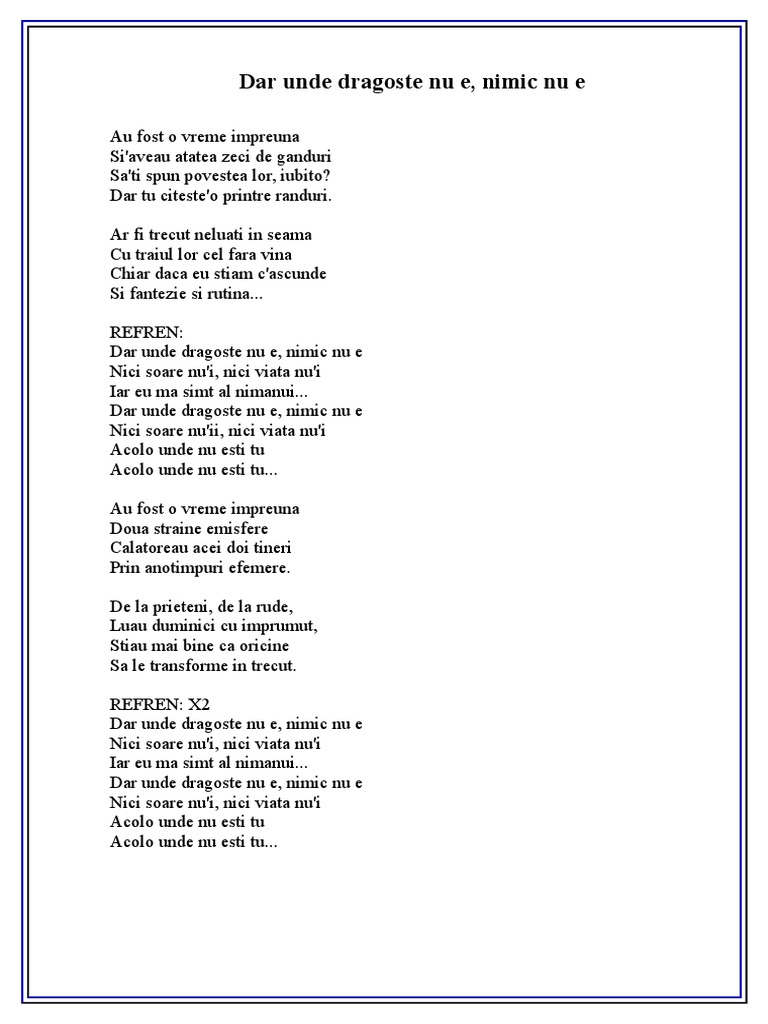 Dar unde dragoste nu e. De la prieteni de la rude luau duminici cu imprumut. Dar unde dragoste nu e nimic nu e nici soare nu i nici viata nu i iar eu ma simt a nimanui. Dar unde dragoste nu e nimic nu e nici soare nu ii nici viata nu i acolo unde nu esti tu acolo unde nu esti tu. Acolo unde nu esti tu bis au fost o vreme impreuna doua straine emisfere calatoreau acei doi tineri prin anotimpuri efemere.