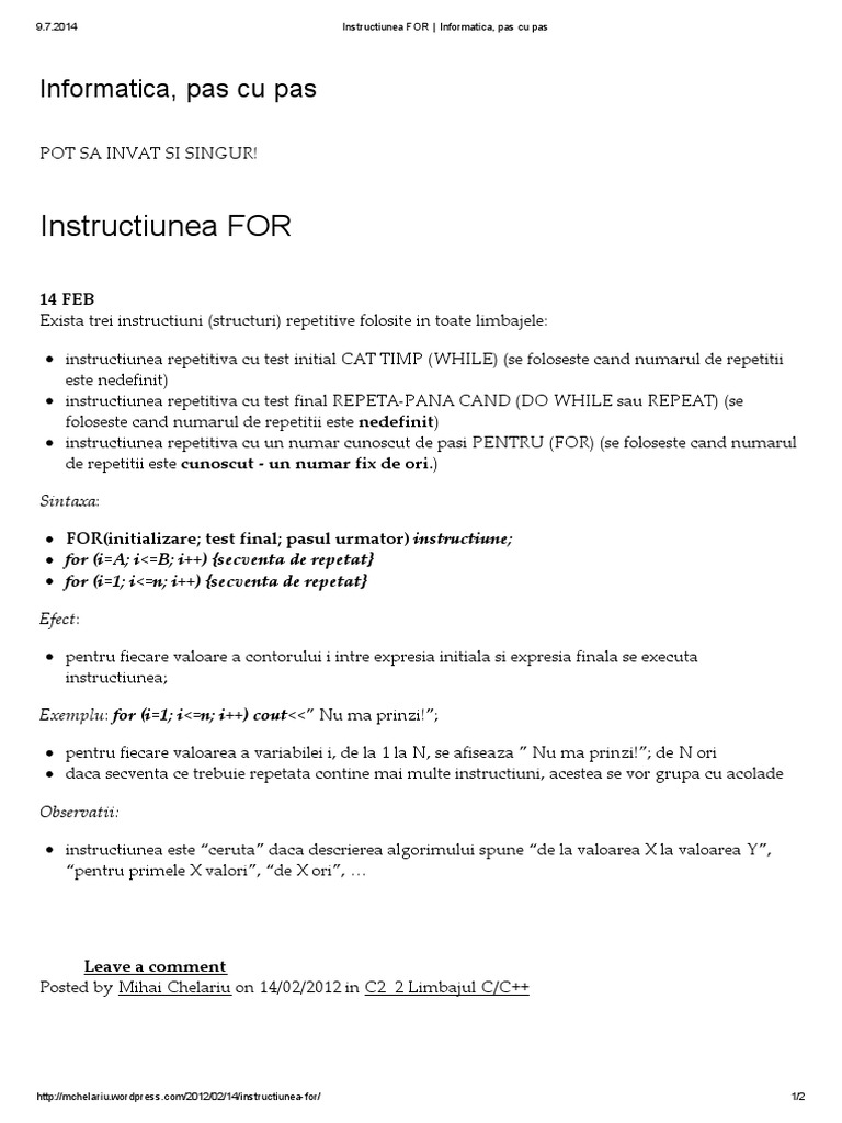 Cu efort zero obtii rezultat zero. Aceste lectii au rolul de a va familiariza cu principalele instrumente si metode de programare in limbajul c si c. Informatica pas cu pas. C pas cu pas.