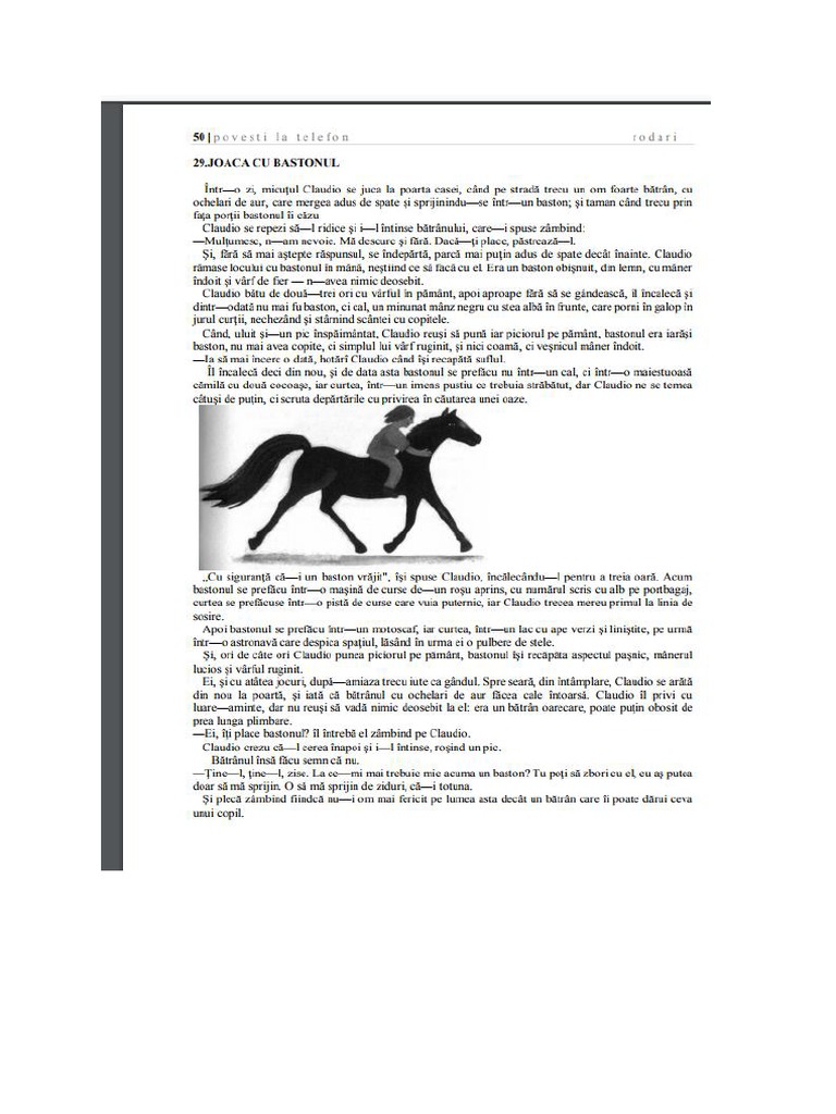 Rezumat la povestirea joaca cu bastonul in care este vorba despre un baiat pe nume claudio care a primit cadou de la un batran un baston fermecat care se transforma in cal in camila in masina de curse si in alte lucruri frumoase cu care baiatul se putea distra mereu.
