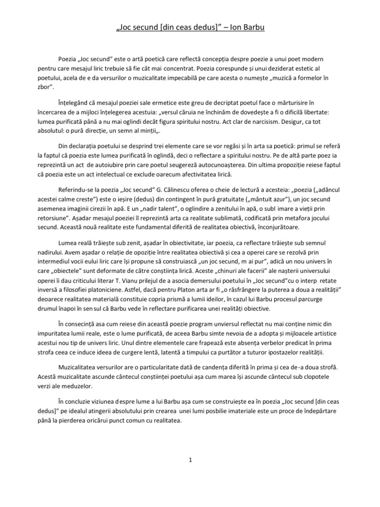 Joc secund comentariu. De ion barbu ion barbu pe numele sau adevarat dan barbilian a fost poet si matematician roman de exceptie. Joc secund din ceas dedus ion barbu poezia modernista iunie 19 2009 at 12 33 pm lasă un comentariu ion barbu este un adept al unui lirism al unei poezii nonafective pure conceptualizate care sa se adreseze unui public capabil a descifra simbolurile. Ca matematician acesta s a impus prin spatiile barbiliene. Joc secund analiza literara si comentariu de ion barbu de ion barbu sinteza referat eseu opera a lui ion barbu inscrie te si imbunatateste enciclopedia autorilor romani.