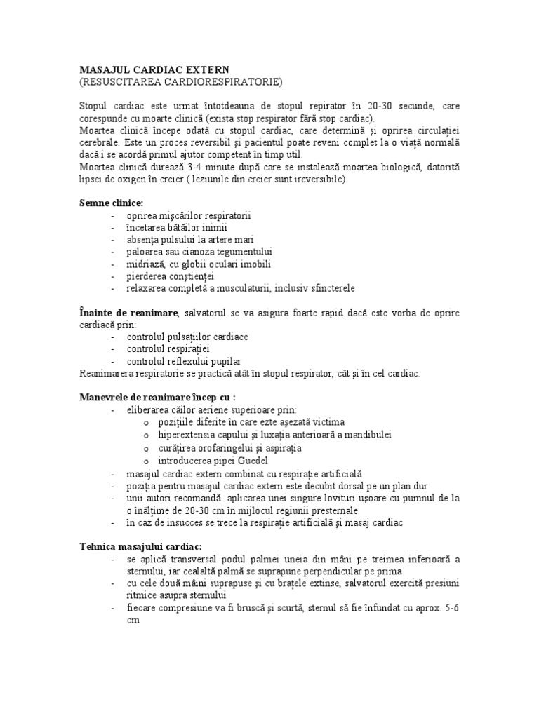 Masajul cardiac extern resuscitarea cardiorespiratorie stopul cardiac este urmat întotdeauna de stopul repirator în 20 30 secunde care corespunde cu moarte clinică exista stop respirator fără stop cardiac.