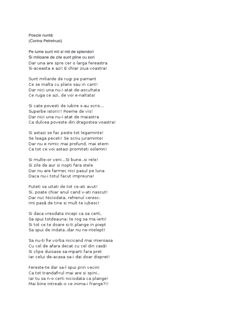Posted by lorinna in poezii poezii de nunta scrie un comentariu. Pe această pagină găsești texte citate mesaje și poezii de felicitare de nuntă în limba română. Florina popa 625 731 views. Sa vedem asadar cum arata lista cu cateva mesaje scurte prin care ii poti felicita pe miri.