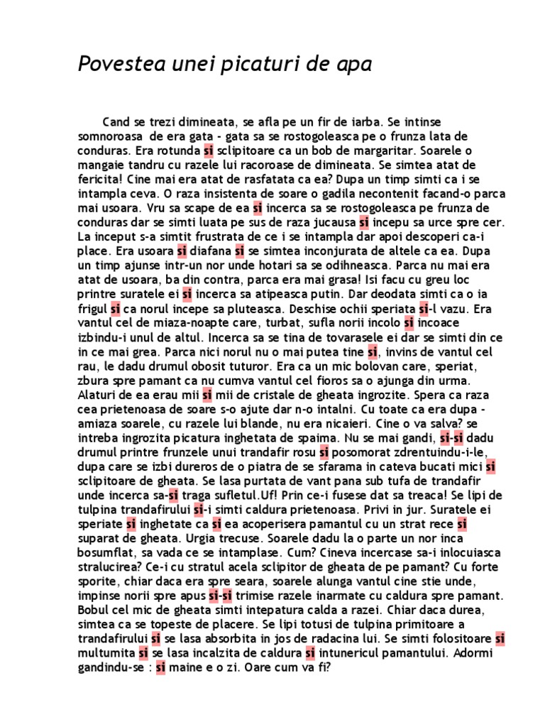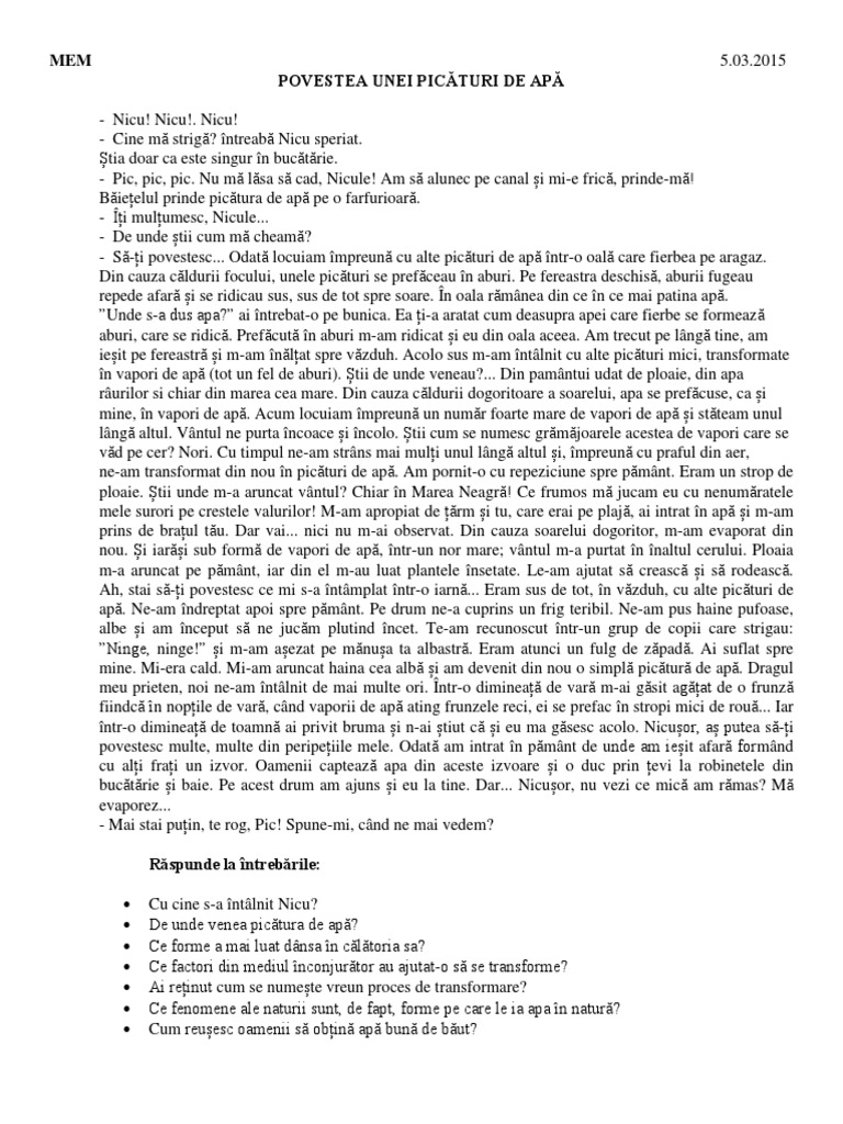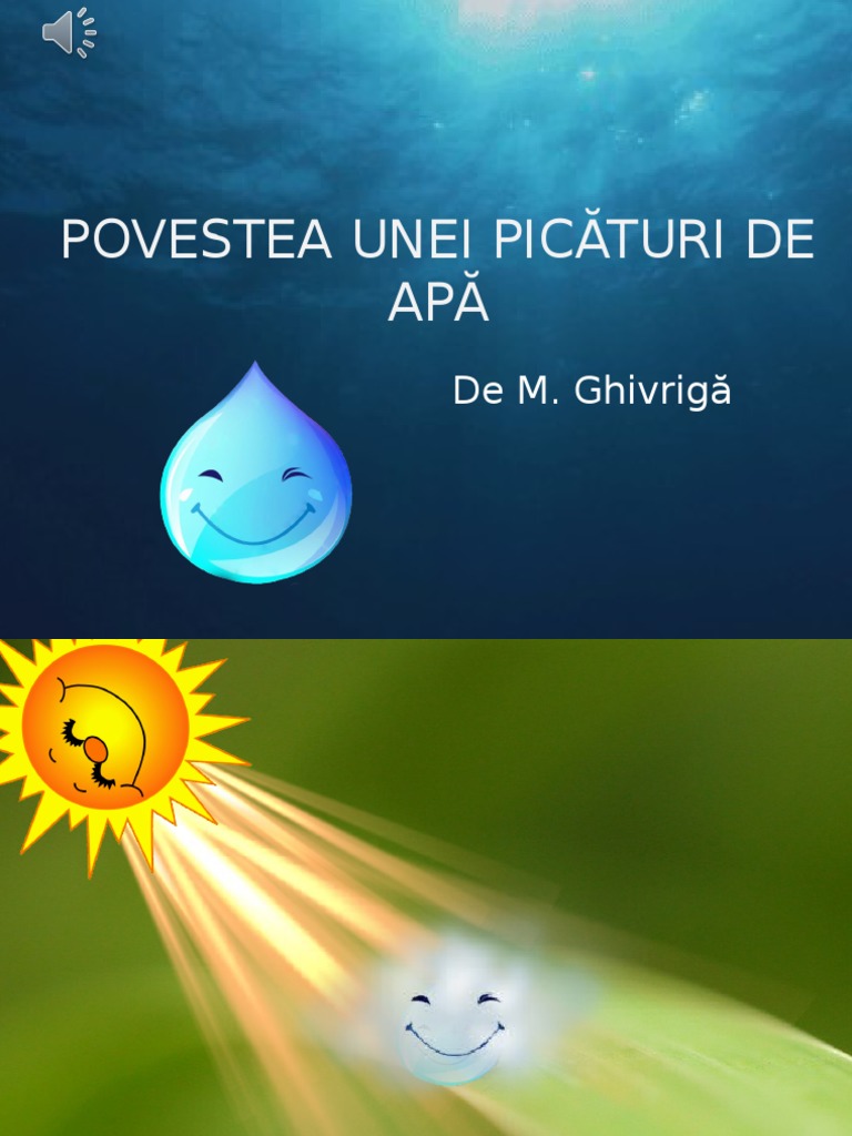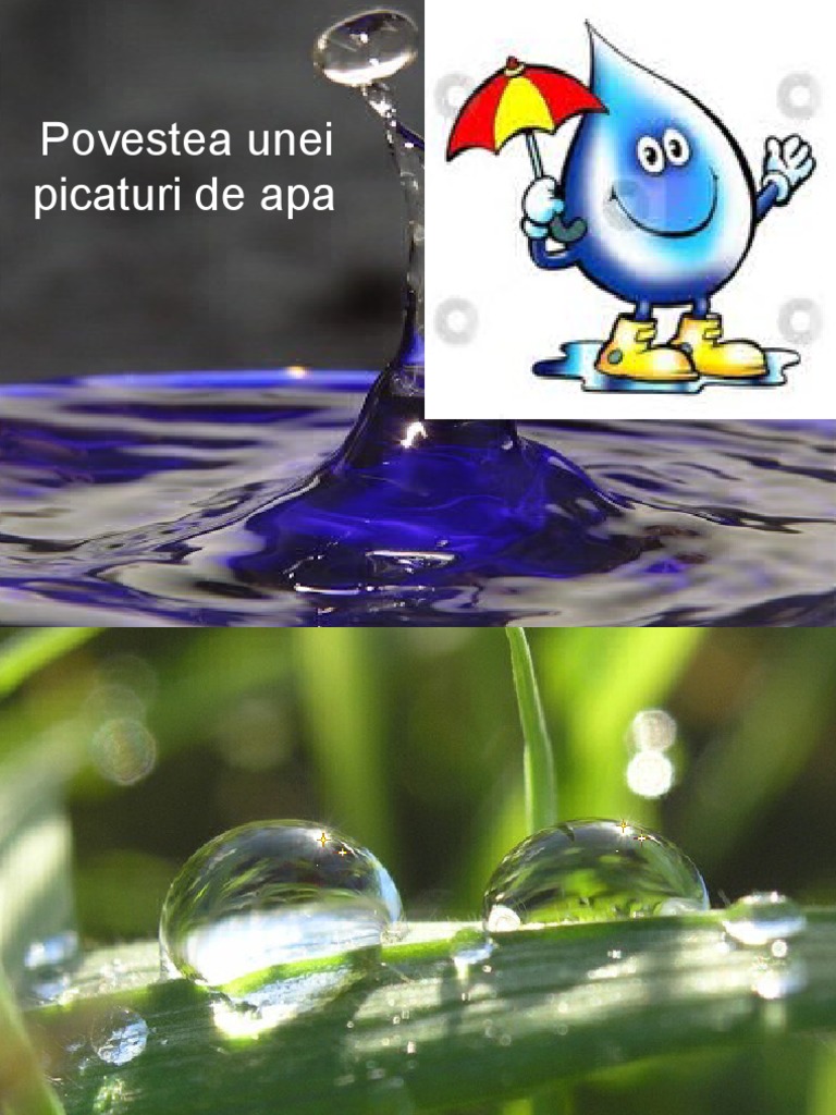 Acum locuiam împreună un număr foarte mare de va pori de apă și stăteam unul lângă altul. Când se trezi dimineaţă se află pe un fir de iarbă. Povestea unei picaturi de apa evenimentul regional al moldovei sute de copii din iasi au invatat lucruri inedite despre apa prin intermediul unei piese de teatru puse in scena de catre un grup de elevi de la colegiul national mihai eminescu. Se intinse somnoroasa de era gata gata sa se rostogoleasca pe o frunza lata de conduras.
